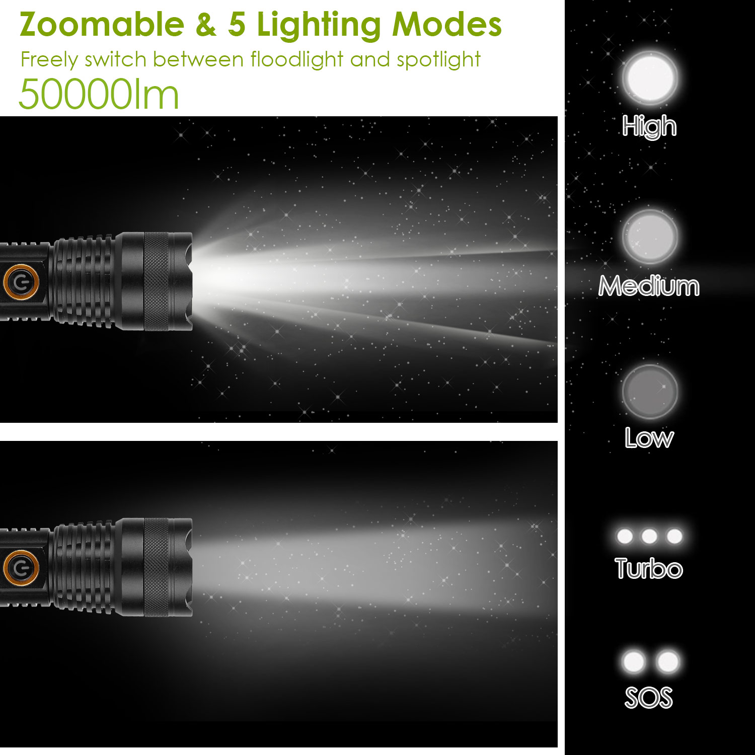 5 Lighting Modes: (High, Medium, Low, Turbo, SOS) Switch through Pressing Button